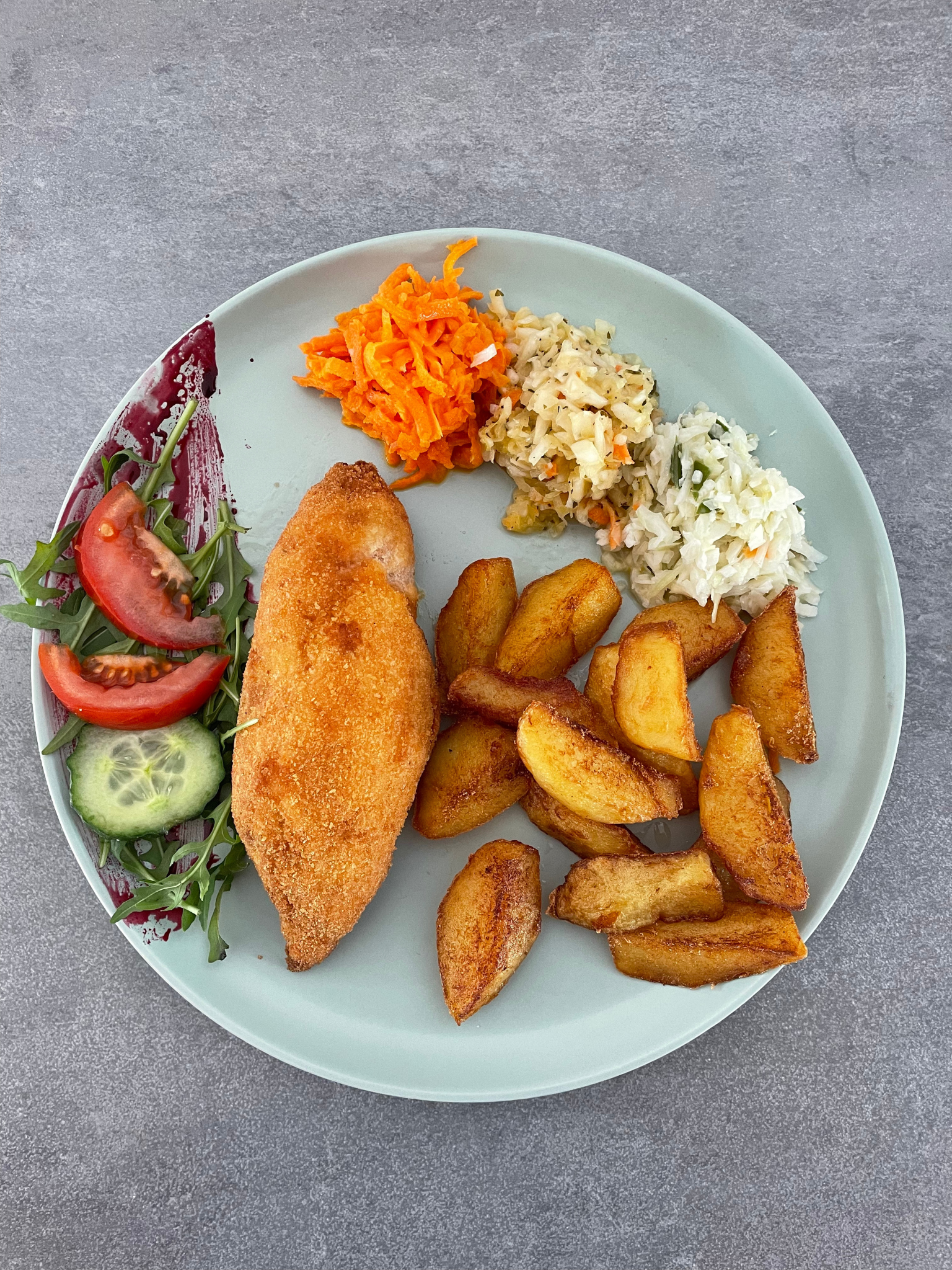Tradycyjny kotlet de volaille z zestawem surówek i ziemniakami opiekanymi.