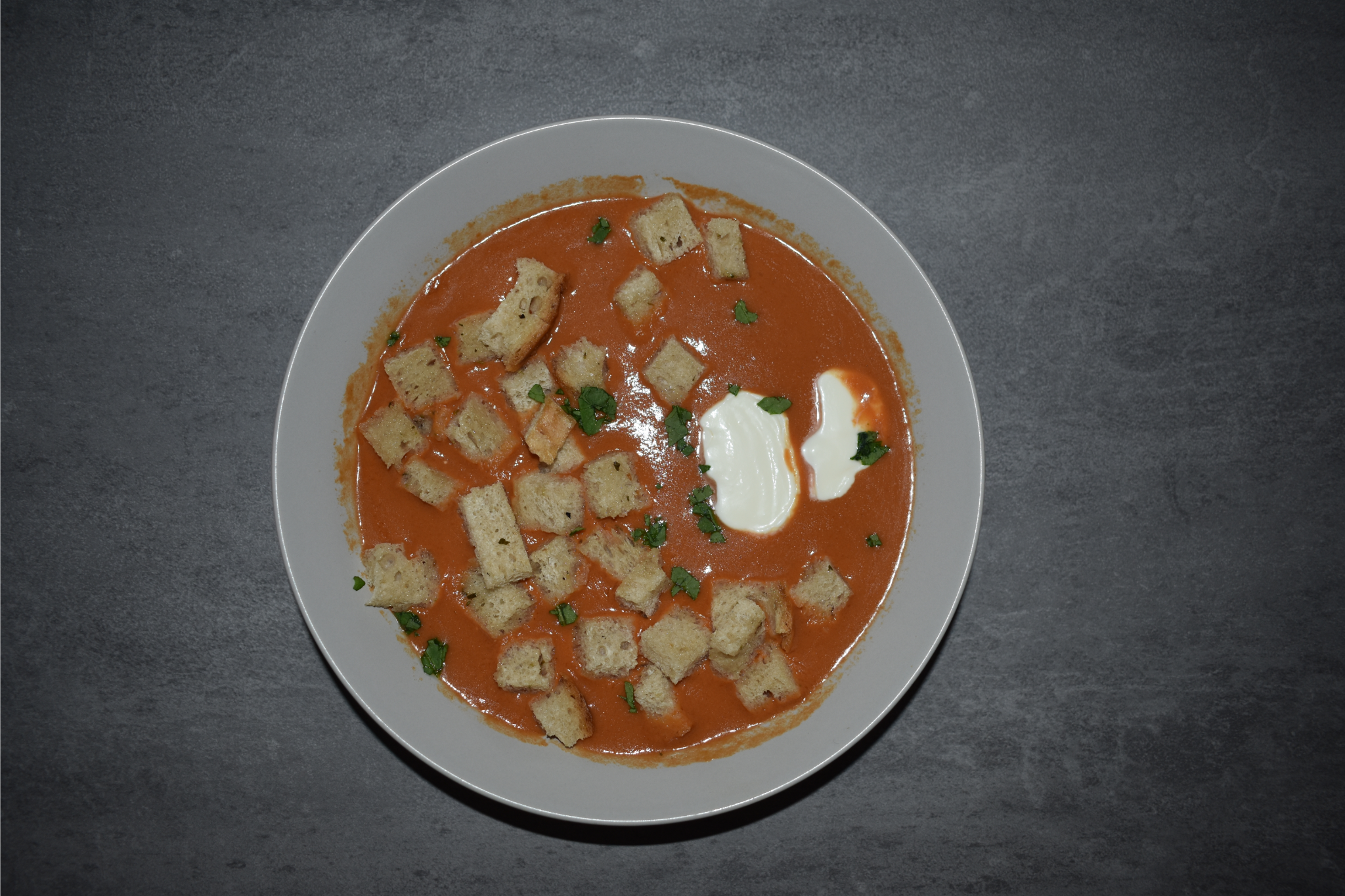 Krem pomidorowo-paprykowy z mozarellą i grzankami.