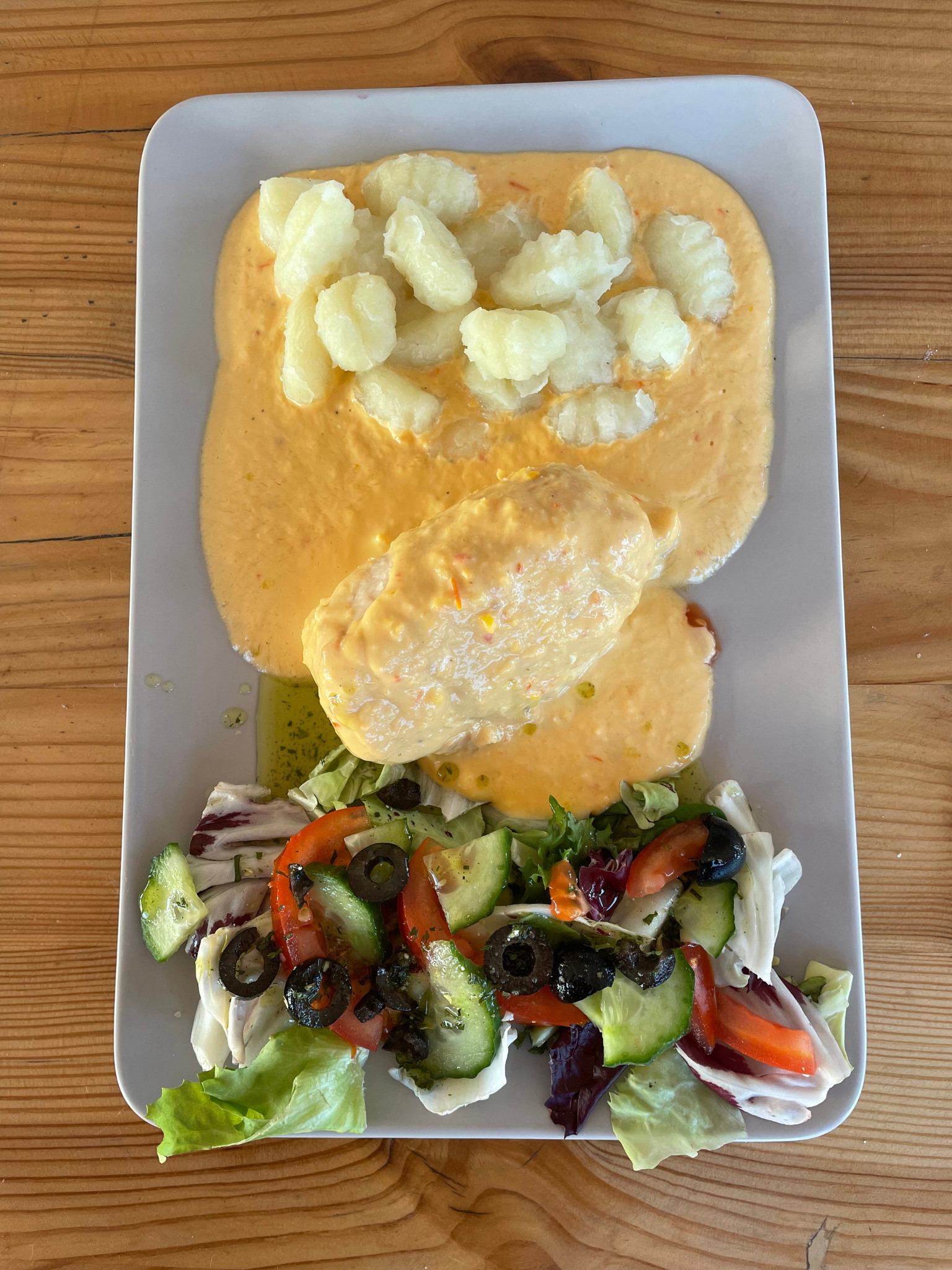 Domowe roladki z kurczaka ze szpinakiem w sosie śmietanowymi, warzywami oraz gnocchi.