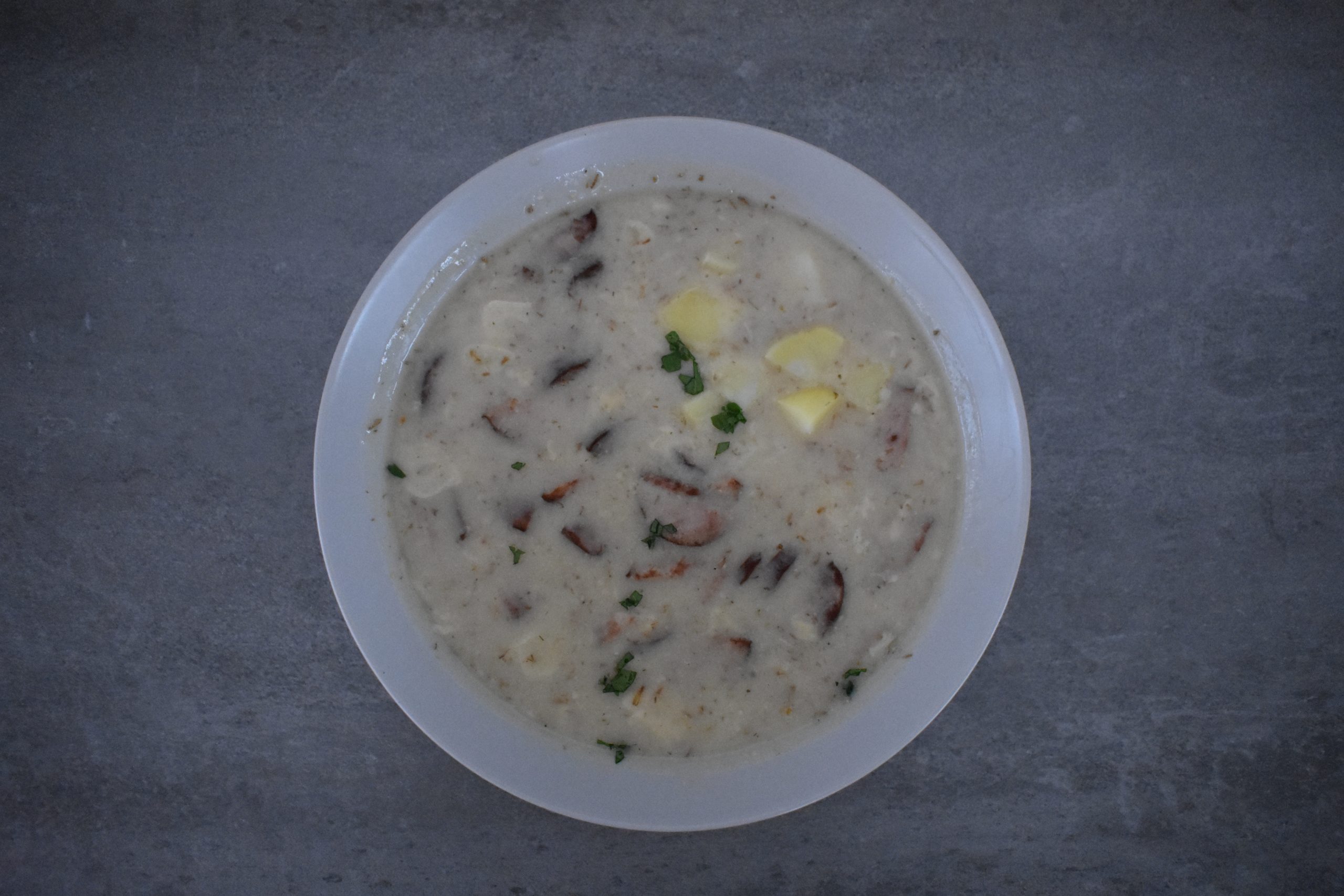 Tradycyjny żurek beskidzki z białą kiełbasą, jajkiem i ziemniakami.
